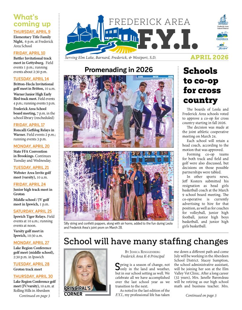 Check out the April 2026 issue of the Frederick Area F.Y.I. newsletter serving Frederick, Barnard, Westport, and Elm Lake in northern Brown County, S.D.